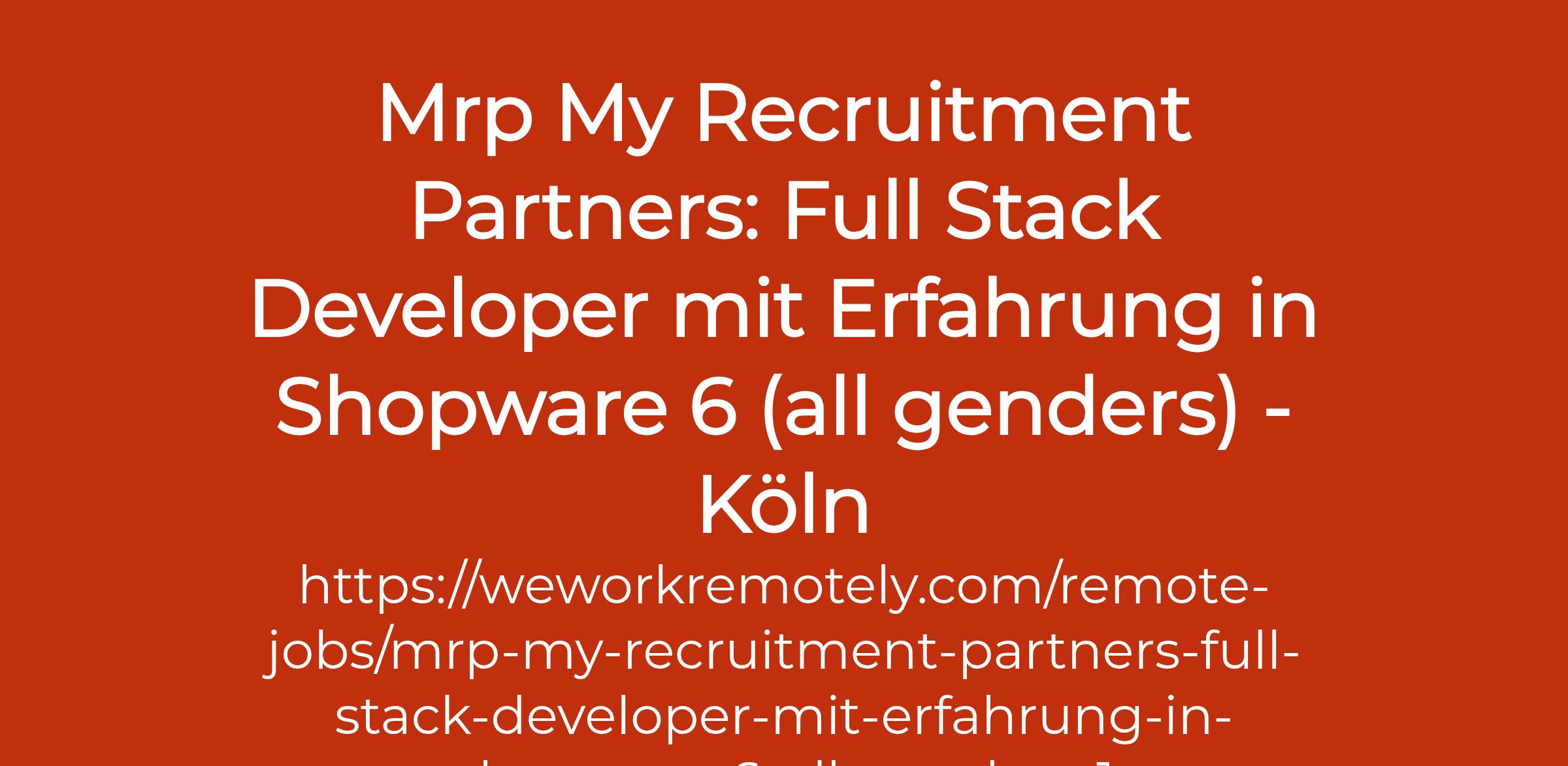 Job descriptionDu bist nicht der typische Full Stack Developer? Wir suchen einen Developer, der transparente Kommunikation, sauberes Coding und qualitativ hochwertige Arbeit nicht nur als Floskel verwendet.Das „montagmorgens“-Gefühl gibt es bei uns nicht:Bei uns darfst Du so sein, wie Du wirklich bist! Koro, Zalando, FC Moto, Wöhrl – Abwechslungsreiche Aufgaben und ProjekteWir leben Feedback und fördern dies!Von Bahncard bis WalkingPad – wir lieben individuelle Ziel- & GehaltssystemeWeiterbildungsmaßnahmen gehören für uns zum AlltagDeine Wunsch-HardwareModerne Büros und die Möglichkeit 100 % remote zu arbeiten80–90 aktive Kunden, die man durch Werbung auf ProSieben oder Höhle der Löwen kenntTeamspirit wird bei uns großgeschrieben - Nerfgun und lustige Memes gehören für uns dazu!minimaler bis starker Kundenkontakt – du entscheidestTech Stack: https://stackshare.io/companies/8mylez-gmbhDiese Aufgaben warten auf DichEin variabler Mix aus Frontend und Backend – HTML, CSS & JavaScript (Vue.Js, React), PHP (Symfony)Konfiguration & Weiterentwicklung von einzigartigen OnlineshopsImplementierung & Umsetzung von Layouts und vorhandenen DesignsUmsetzung komplexer Funktionen und ErweiterungenEntwicklung von innovativen Ideen für den E-CommerceErkunden und Lernen von modernen und neuen WebtechnologienDas bringst Du mitMind. 2 Jahre Erfahrung in Shopware 6Gute Kenntnisse in PHP, insbesondere SymfonyErfahrung mit JavaScript-Frameworks wie Vue.js oder ReactSicherer Umgang mit Git und gängigen Entwicklungs-WorkflowsSpaß, Leidenschaft und persönliches Interesse am ProgrammierenVerantwortungs- und QualitätsbewusstseinLösungsorientierte und selbstständige ArbeitsweiseÜber unsAls ambitionierte E-Commerce-Agentur, mit rund 35 Menschen an Bord, gestalten wir das digitale Einkaufen von morgen und betreuen marktführende Onlineshops. Werde jetzt Teil und hilf mit, das Internet jeden Tag schöner, besser und schneller zu machen.Dir fehlt etwas in unserer Liste?Dann lass es uns in Deinem Anschreiben wissen.All done!Your application has been successfully submitted!Other jobs
