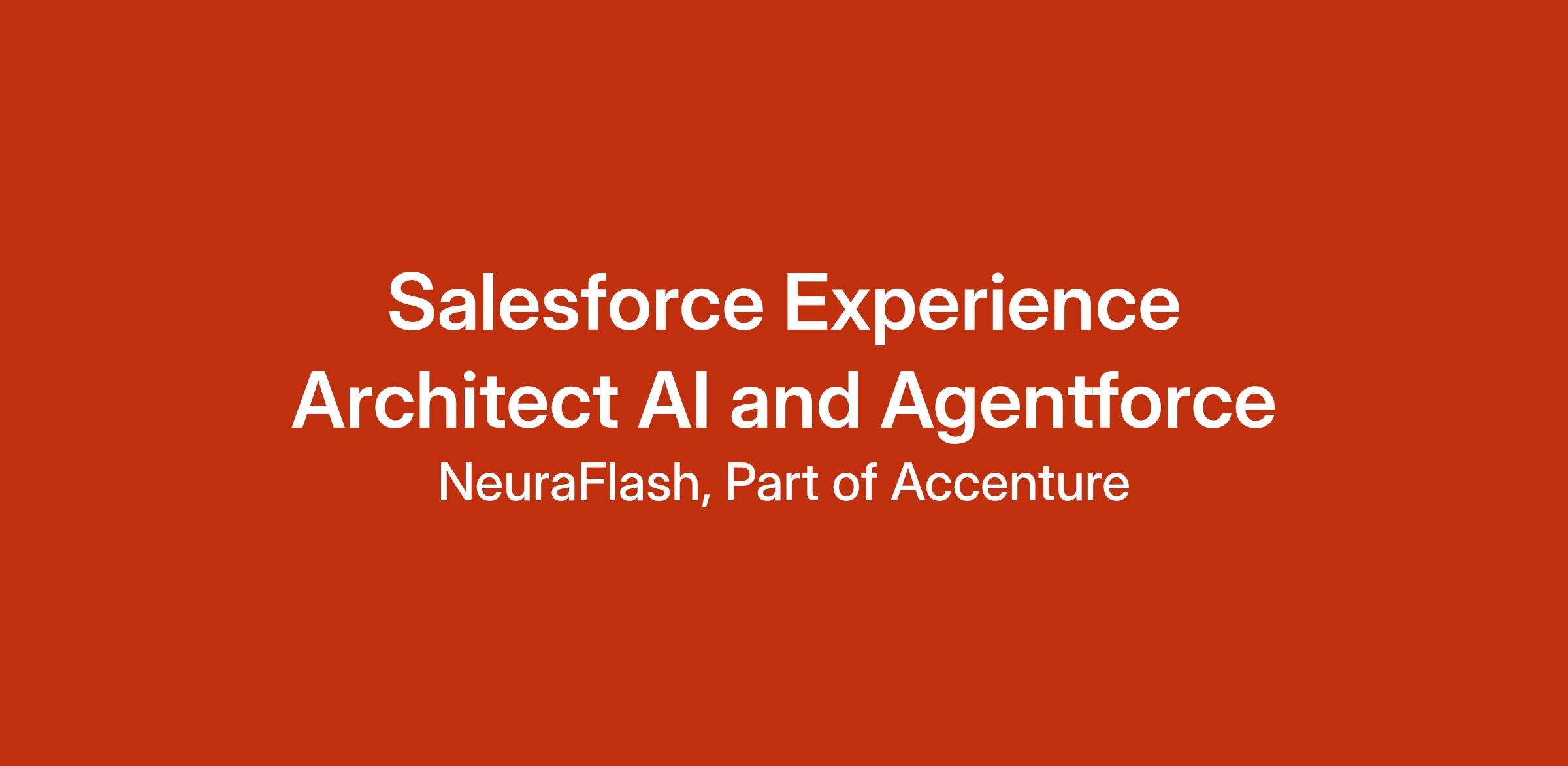 Why NeuraFlash, Part of Accenture:At NeuraFlash, Part of Accenture, we are redefining the future of business through the power of AI and groundbreaking technologies like Agentforce. As a trusted leader in AI, Amazon, and Salesforce innovation, we craft intelligent solutionsâintegrating Salesforce Einstein, Service Cloud Voice, Amazon Connect, Agentforce and moreâto revolutionize workflows, elevate customer experiences, and deliver tangible results. From conversational AI to predictive analytics, we empower organizations to stay ahead in an ever-evolving digital landscape with cutting-edge, tailored strategies.We are proud to be creating the future of generative AI and AI agents. Salesforce has launched Agentforce, and NeuraFlash, Part of Accenture, was selected as the only partner for the private beta prior to launch. Post-launch, we've earned the distinction of being Salesforce's #1 partner for Agentforce, reinforcing our role as pioneers in this transformative space.Be part of the NeuraFlash, Part of Accenture journey and help shape the next wave of AI-powered transformation. Here, you'll collaborate with trailblazing experts who are passionate about pushing boundaries and leveraging technologies like Agentforce to create impactful customer outcomes. Whether you're developing advanced AI-powered bots, streamlining business operations, or building solutions using the latest generative AI technologies, your work will drive innovation at scale. If you're ready to make your mark in the AI space, NeuraFlash, Part of Accenture is the place for you.As an Experience Architect, AI & Agentforce, you will be responsible for driving the solution for and building Agentforce-powered experiences for users to deliver impactful business value to our clients. You'll work with our talented AI team to make significant contributions to our success and delight customers. This position is focused on experience design, solution design, architecture, and execution for GenAI