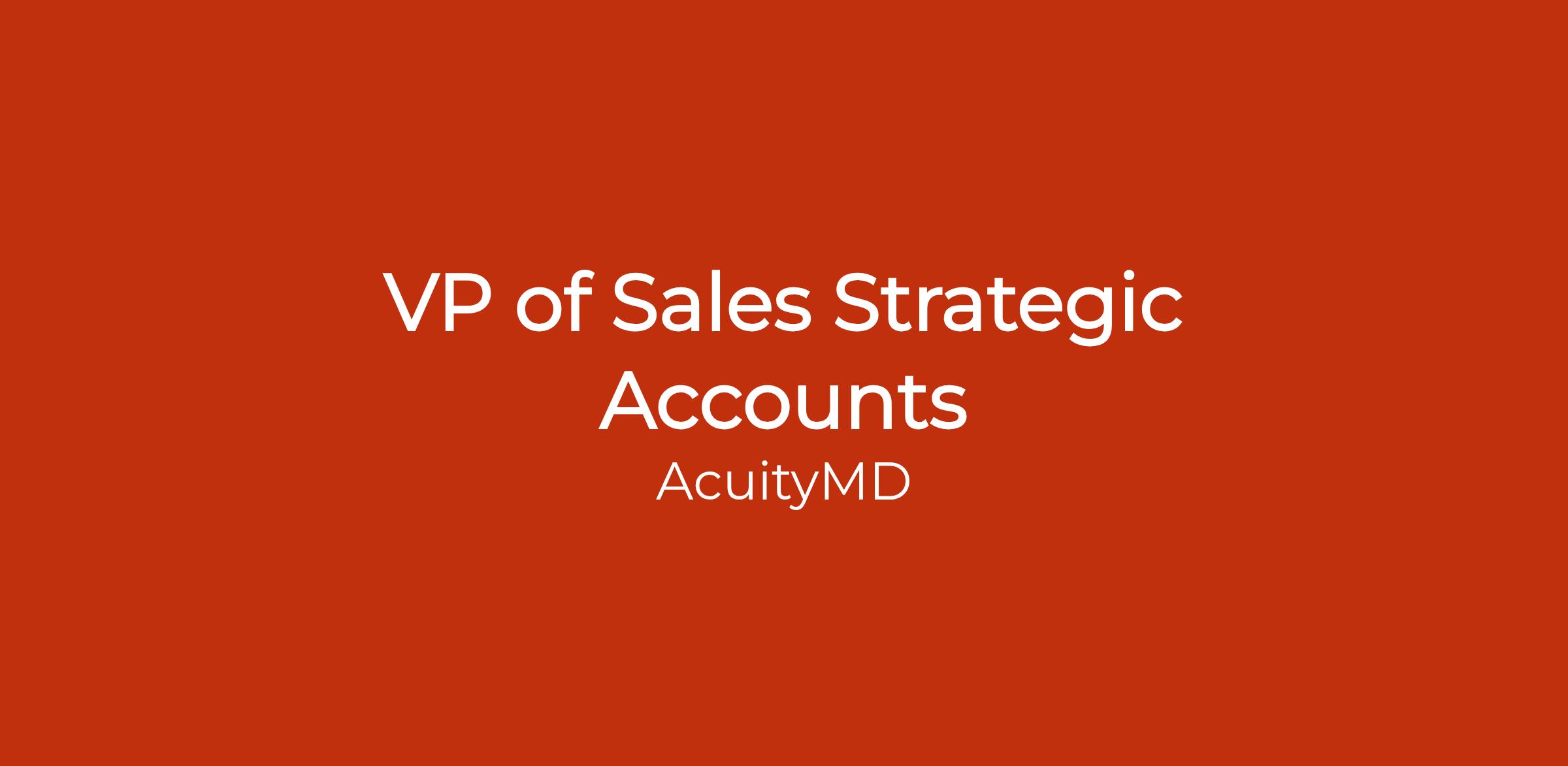VP of Sales, Strategic AccountsAcuityMD is a software and data platform that accelerates access to medical technologies. We help MedTech companies understand how their products are used, why customers vary, and identify opportunities for physicians to better serve their patients. Each year, the FDA approves ~6,000 new medical devices. Our solution helps MedTech companies get these products to physicians more effectively so they can improve patient care with the latest technology. We're backed by Benchmark, Redpoint, ICONIQ Growth, and Ajax Health. We're a high-growth SaaS company scaling rapidly.In this role, you evangelize a new way of doing things - one that serves to drive rapid acceleration of product adoption and growth and that allows our customers to build and develop or empower a modern world-class enterprise sales team. You will lead the charge that helps them see new ways to meet customer acquisition and revenue targets. By doing so effectively, you will build on the AcuityMD brand. We want a collaborative leader who can help build an industry-changing company with passion, drive, maturity, and impeccable business acumen. We are looking for an evangelical seller and leader of sellers, who can inspire, teach, nurture and lead sellers to be their best -every day. The 1% improvement mindset is a must.Team MissionWe are building a best-in-class Commercial Team and establishing a repeatable go-to-market motion. We are hiring a team of high-caliber Enterprise SaaS sales, marketing, and customer success professionals to thoughtfully engage VPs, General Managers, and other corporate decision-makers across the Medical Device Industry. Our Commercial Team takes a proactive, consultative, and high-touch approach when working with customers, investing h